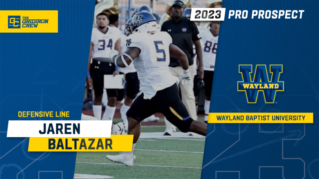 Jaren Baltazar: 2023 Pro Prospect Interview The Gridiron Crew 3 years ago Name: Jaren BaltazarSchool: Wayland Baptist UniversityPosition: DLHeight: 6-0Weight: 255