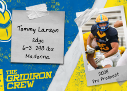 Name: Tommy LarsonSchool: Madonna University (prior years were Saginaw Valley State University and Michigan State University) Position: EDGE/DEHeight: 6-3Weight: 248 Q: What goals did you set and/or accomplish in your final collegiate season? I set a sack goal of 7 and surpassed it by 1. I finished the season with 8 sacks, which was a great goal reached. Q: What…