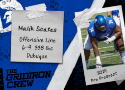 Name: Malik ScatesSchool: University Of Dubuque Position: C/OG Height: 6-4Weight: 338 Q: What goals did you set and/or accomplish in your final collegiate season? The main goal I set for myself was to either give up 0 or only just 1 sack this season and only 1 person got past me. Q: What would your coaches and teammates say about the type…